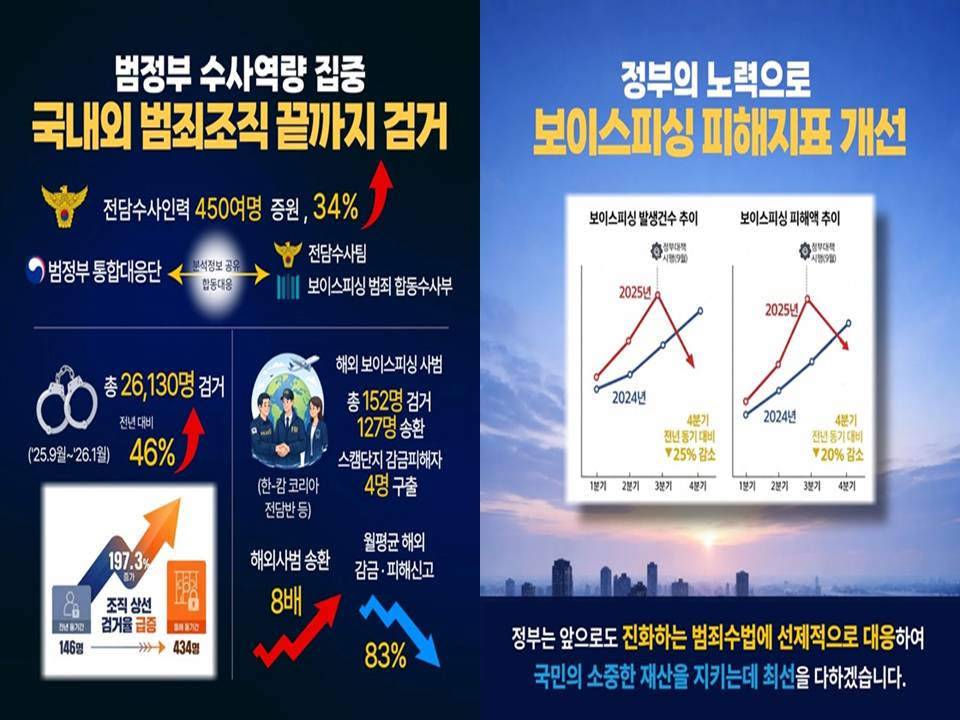 - 검거율 46% 증가: 지난 5개월간('25.9~'26.1) 총 26,130명을 검거했습니다. 특히 조직의 윗선인 **상선 검거율은 197.3%**나 폭증했습니다.