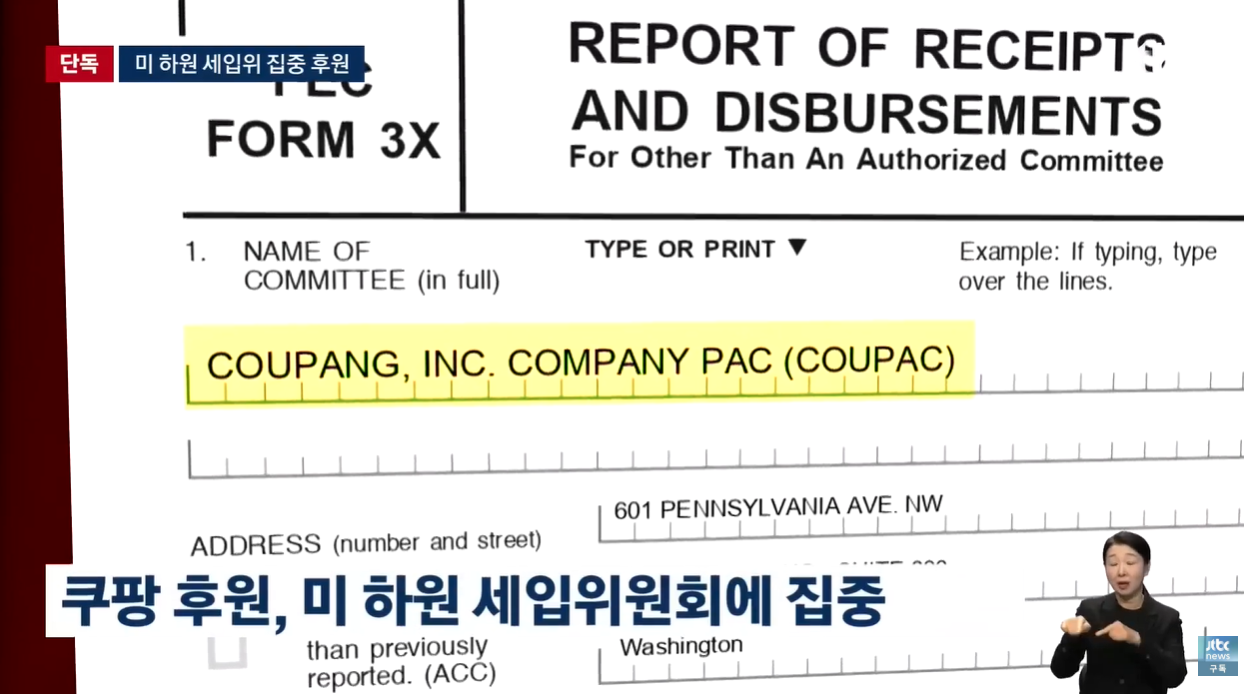 JTBC가 미국 연방선거위원회(FEC)의 공시 자료를 전수 분석한 결과, 쿠팡의 정치자금 기구인 '쿠팩(COUPAC)'의 자금이 특정 위원회에 집중된 정황이 드러났습니다.