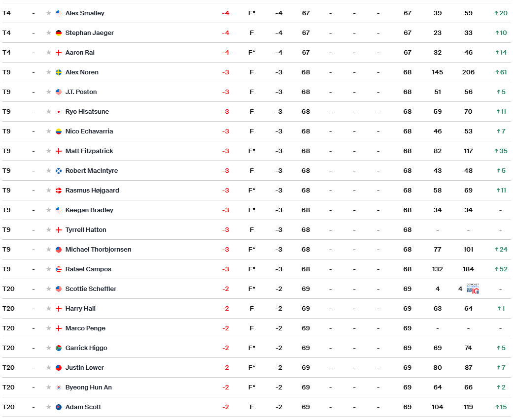 디펜딩 챔피언 잰더 쇼플리 역시 1오버파 72타로 공동 61위. 버디는 2개를 잡았지만 보기 1개, 더블보기 1개가 치명적이었습니다. 무엇보다 셰플러, 매킬로이와 함께 16번홀(파4)에서 세 선수 모두 더블보기를 범한 장면은 팬들에게 충격을 안겼습니다. 535야드에 이르는 난이도 높은 홀에서 모두가 고전한 셈이죠. 셰플러와 쇼플리는 티샷을 페어웨이에 잘 보냈지만, 젖은 잔디에 묻은 진흙이 문제였습니다. 두 번째 샷이 물에 빠지면서 더블보기라는 최악의 결과로 이어졌습니다.