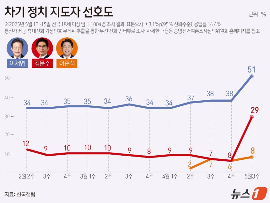 한국갤럽이 지난 5월 13일부터 15일까지 전국 만 18세 이상 성인 1004명을 대상으로 실시한 최신 여론조사에 따르면, 이재명 후보의 지지율이 51%로 집계되었습니다. 김문수 국민의힘 후보는 29%로 2위를, 이준석 개혁신당 후보는 8%로 3위를 차지했습니다.