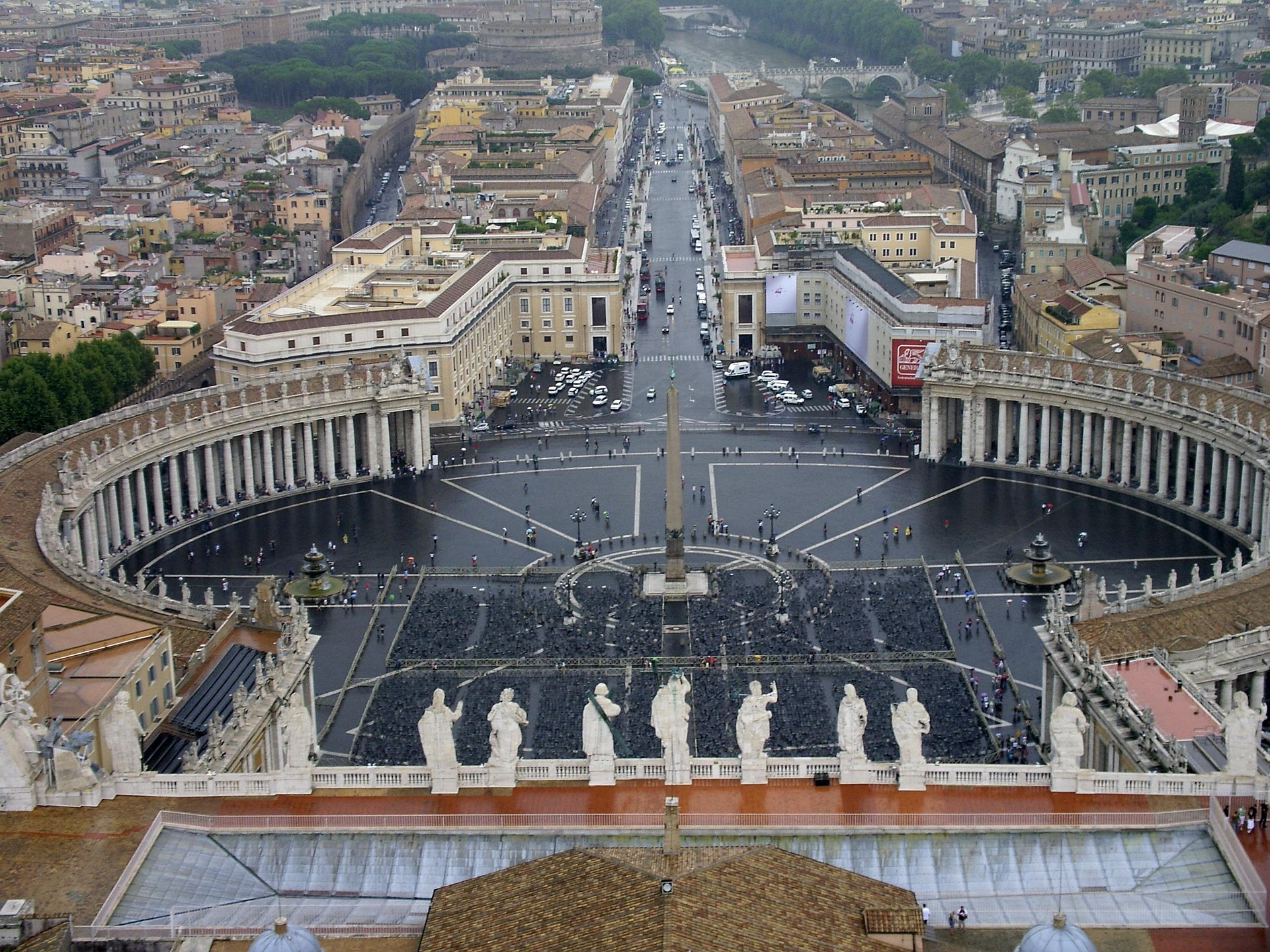 성 베드로 대성당 앞에 펼쳐진 광장은 1656년부터 1667년까지 11년 동안 베르니니의 설계로 만들어졌습니다. 이 타원형 광장(196 x 149미터)은 마치 교회가 세상을 품에 안는 듯한 상징적 의미를 담고 있습니다.