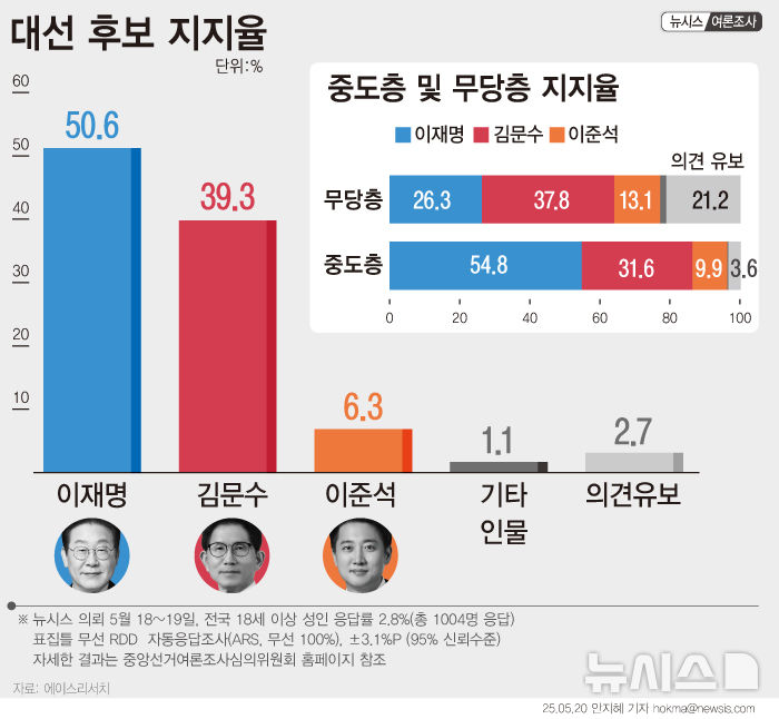뉴시스와 에이스리서치가 공동으로 전국 만 18세 이상 남녀 1,004명을 대상으로 지난 5월 18~19일 실시한 조사 결과, 더불어민주당 이재명 후보가 50.6%를 기록하며 선두를 달리고 있습니다. 국민의힘 김문수 후보는 39.3%로 그 뒤를 이었고, 개혁신당 이준석 후보는 6.3%를 차지했습니다. 기타 후보의 지지율은 1.1% 수준입니다. '지지 후보 없음'은 1.8%, '잘 모르겠다'는 0.9%로 각각 집계되었습니다.