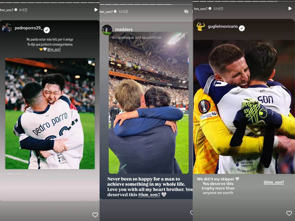 제임스 매디슨 역시 자신의 SNS에 “내 인생에서 누군가의 성취를 보고 이렇게 기뻤던 적이 없다. 쏘니, 진심으로 사랑한다. 넌 이걸 받을 자격이 있다”는 글을 올렸고, 골키퍼 비카리오 또한 “우리 주장이 해냈다. 세상 누구보다 쏘니가 받을 자격이 있다”며 감격을 감추지 않았습니다. 모두가 손흥민과 꽉 안은 사진을 남겼고, 손흥민도 이를 자신의 계정에 공유하며 감동을 더했습니다.