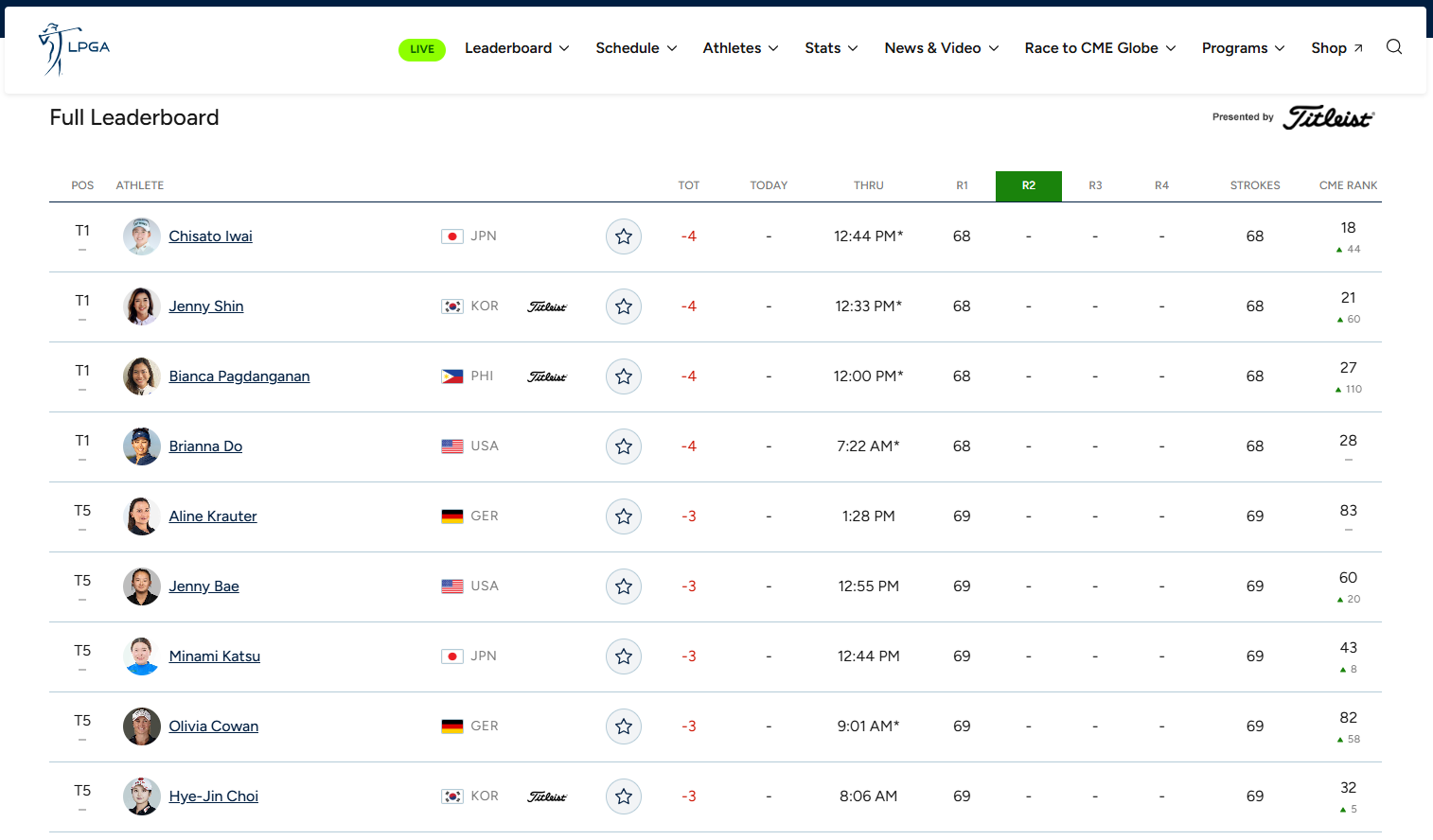 • 이와이 치사토(일본)는 4언더파 단독 선두권 출발: 신지은, 브리아나 도(미국), 비앙카 파그단가난(필리핀) 등과 함께 공동 1위에 오르며 경쟁 구도를 선명하게 만들었습니다.