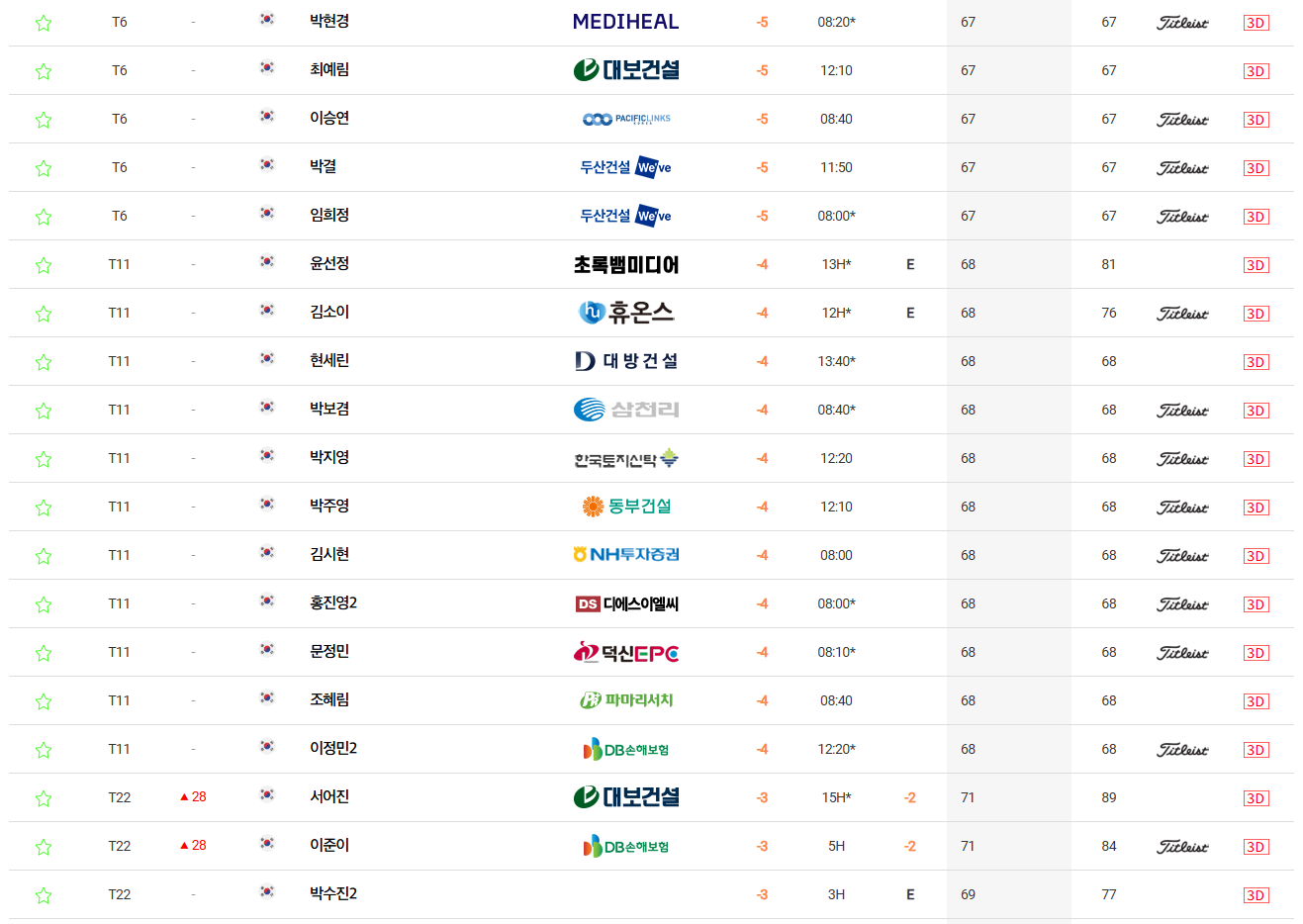 추가로 최은우, 이동은, 정소이 선수가 나란히 6언더파 66타를 기록해 공동 3위 그룹을 형성했습니다. 장타자 이동은의 강력한 추격이 눈에 띄는 부분입니다.