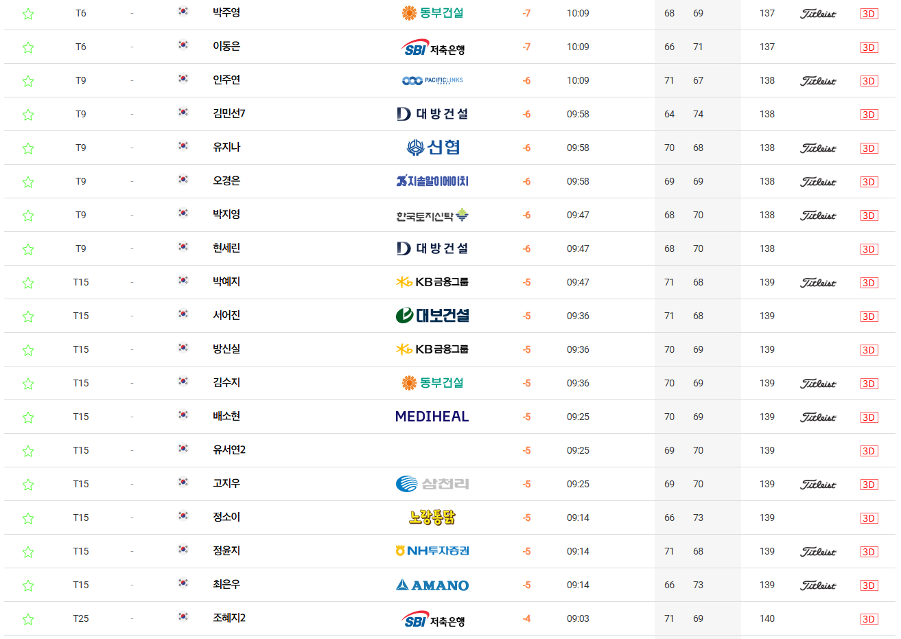 공동 6위(7언더파 137타)에는 박주영과 이동은, 그리고 신예 정지효가 올라 있습니다. 특히 루키 정지효의 상위권 진입은 새로운 스타의 탄생을 예고하는 듯합니다.