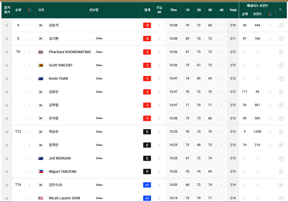 삭산신과 깨우깐짜나, 유송규 외에도 여러 선수들이 상위권에서 경쟁 중입니다. 강윤석은 중간 합계 3언더파 210타로 단독 4위를 차지했으며, 김기환은 1타를 잃고 2언더파 211타를 기록해 단독 5위에 자리했습니다.