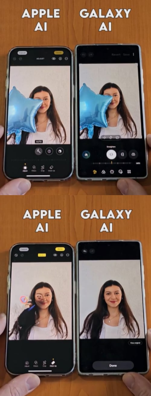 - 애플 AI: 1초 만에 파란 풍선을 지우긴 했지만, 여성의 얼굴이 일그러지면서 결과가 부자연스럽게 변형