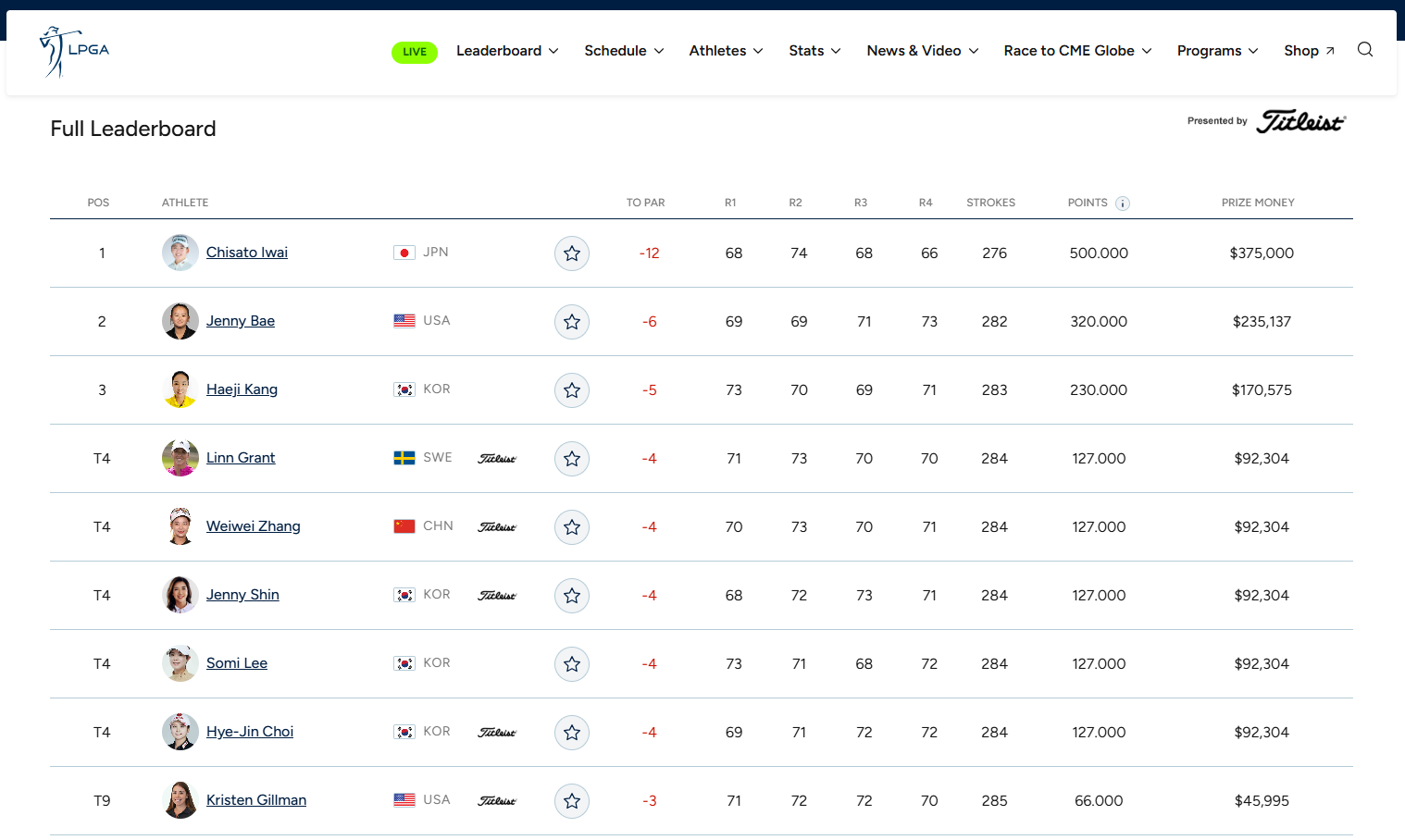 - 공동 4위: 최혜진, 신지은, 이소미(한국) - 4언더파 284타