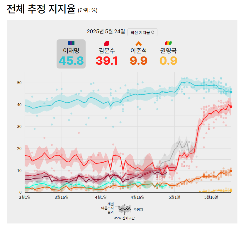 공표금지 직전 발표된 주요 여론조사에서는 이재명 더불어민주당 후보가 김문수 국민의힘 후보를 오차범위 밖에서 앞섰습니다.
