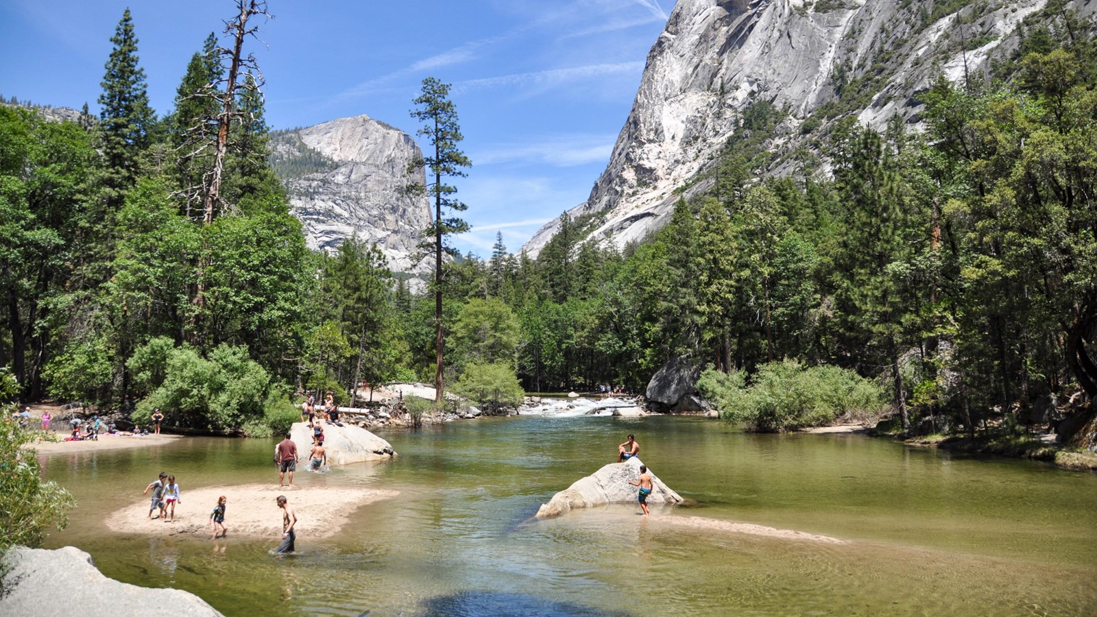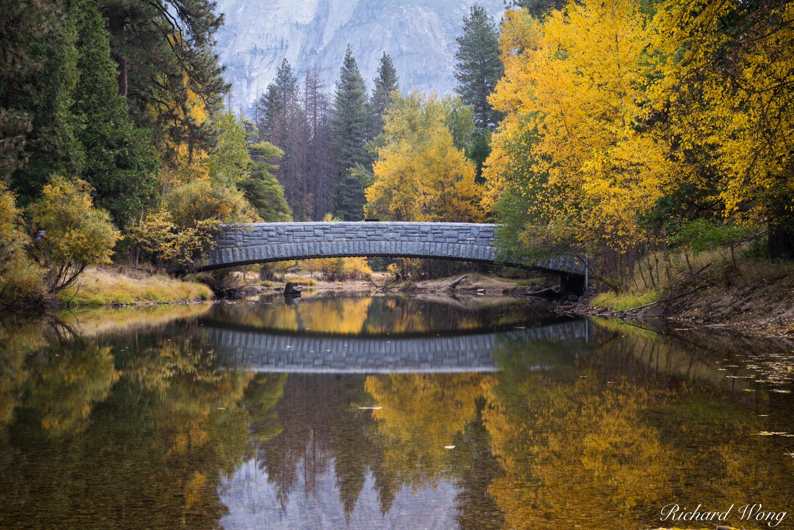 머세드 강에 비치는 하프 돔의 모습을 감상할 수 있는 장소입니다. 물에 비친 하프 돔의 반영이 마치 완전한 돔처럼 보이는 착시를 경험해 보세요.