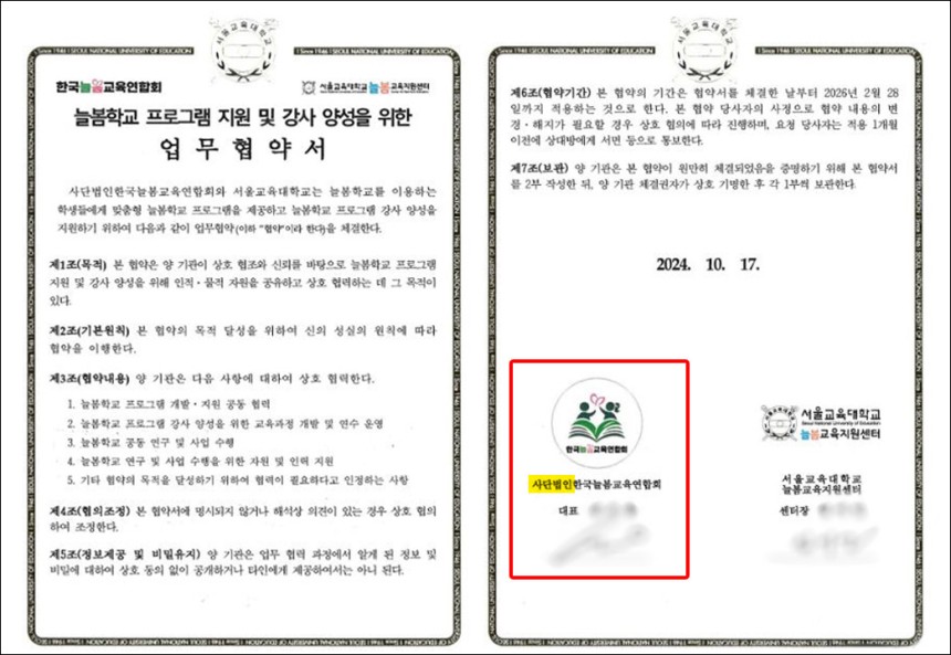 : 2024년 서울교대와의 업무협약서 등에도 ‘사단법인 한국늘봄교육연합회’로 표기됐고, 서울교대 홈페이지에도 동일한 명칭이 사용됐던 사실이 드러났습니다.