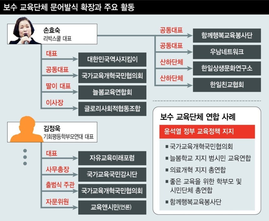 이들이 주도하는 단체들은 주로 윤석열 정부의 핵심 교육정책, 예를 들어 ‘늘봄학교’, ‘의대 정원 확대’ 정책을 공개적으로 지지하거나, 학생인권조례 폐지, 뉴라이트 계열 역사관 확산 등 보수 진영과 맞닿아 있는 입장문, 공동행동, 연합체 결성 등의 움직임을 활발히 벌여 왔습니다.