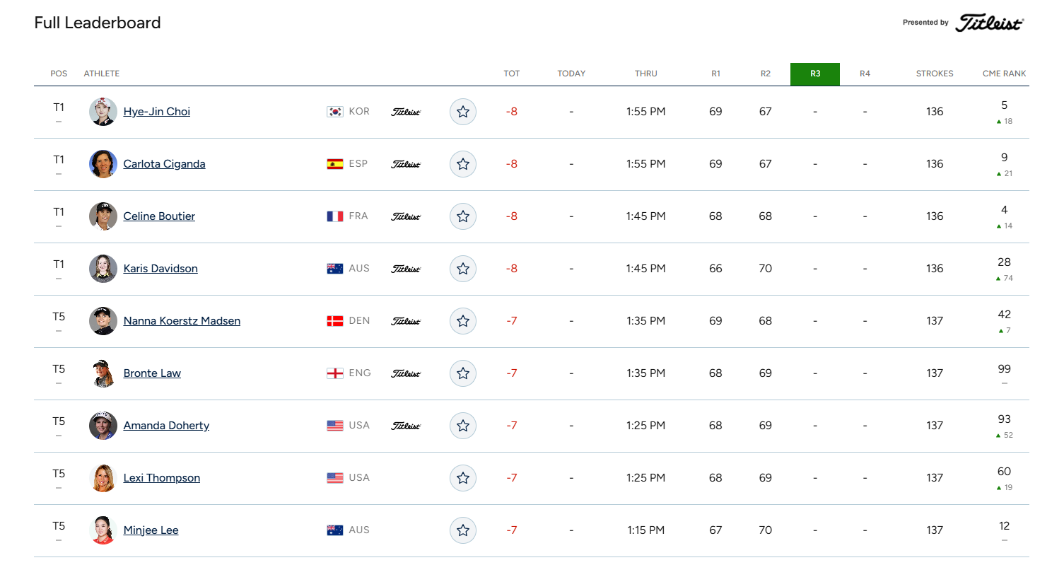 이로써 중간합계 8언더파 136타, 단독 선두가 아닌 카를로타 시간다(스페인)🇪🇸, 셀린 부티에(프랑스)🇫🇷, 그리고 카리스 데이비드슨(호주)🇦🇺와 함께 공동 선두에 올라섰습니다. 🏁