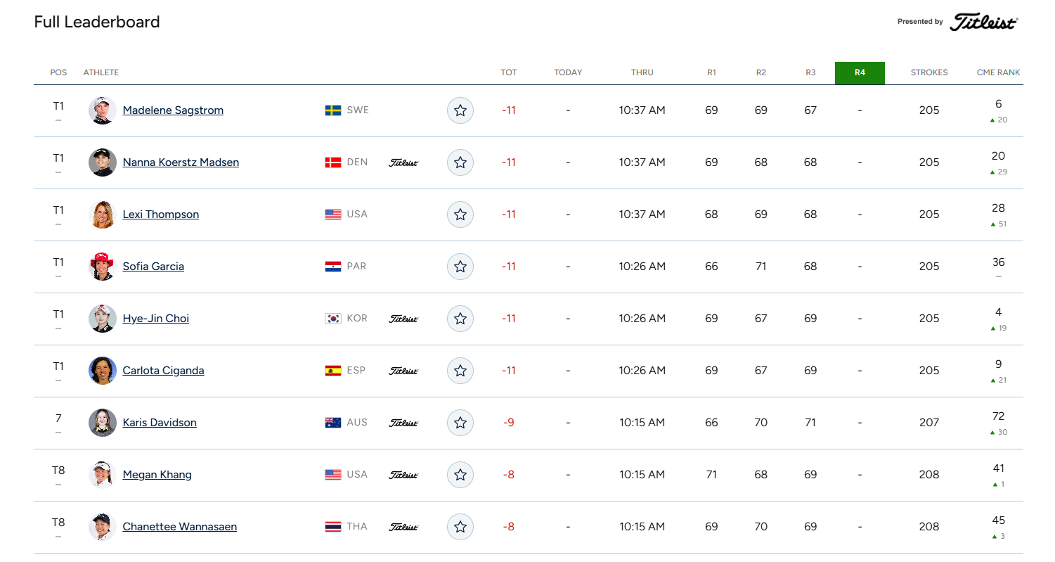 6월 15일(한국시간) 진행된 대회 3라운드에서 최혜진 선수는 보기 없이 버디만 3개를 기록하며 3언더파 69타로 경기를 마쳤습니다. 합계 11언더파 205타로, 렉시 톰슨(미국), 마들렌 삭스트롬(스웨덴), 카를로타 시간다(스페인), 소피아 가르시아(파라과이), 나나 마센(덴마크) 등 세계 정상급 선수들과 함께 공동 선두를 지켰습니다👏