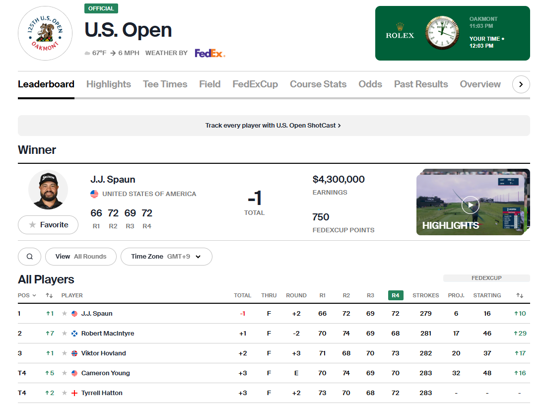 - 최악의 환경에서도 빛난 집중력: 오크몬트는 그린과 러프 모두 상당히 까다로운 코스로 명성이 높으며, 이번 대회는 바람과 기상 조건까지 겹치며 역대급 난이도를 보였습니다. 그런 환경을 뚫고 유일한 언더파로 우승한 스폰의 집중력과 순발력은 박수를 받을 만합니다.