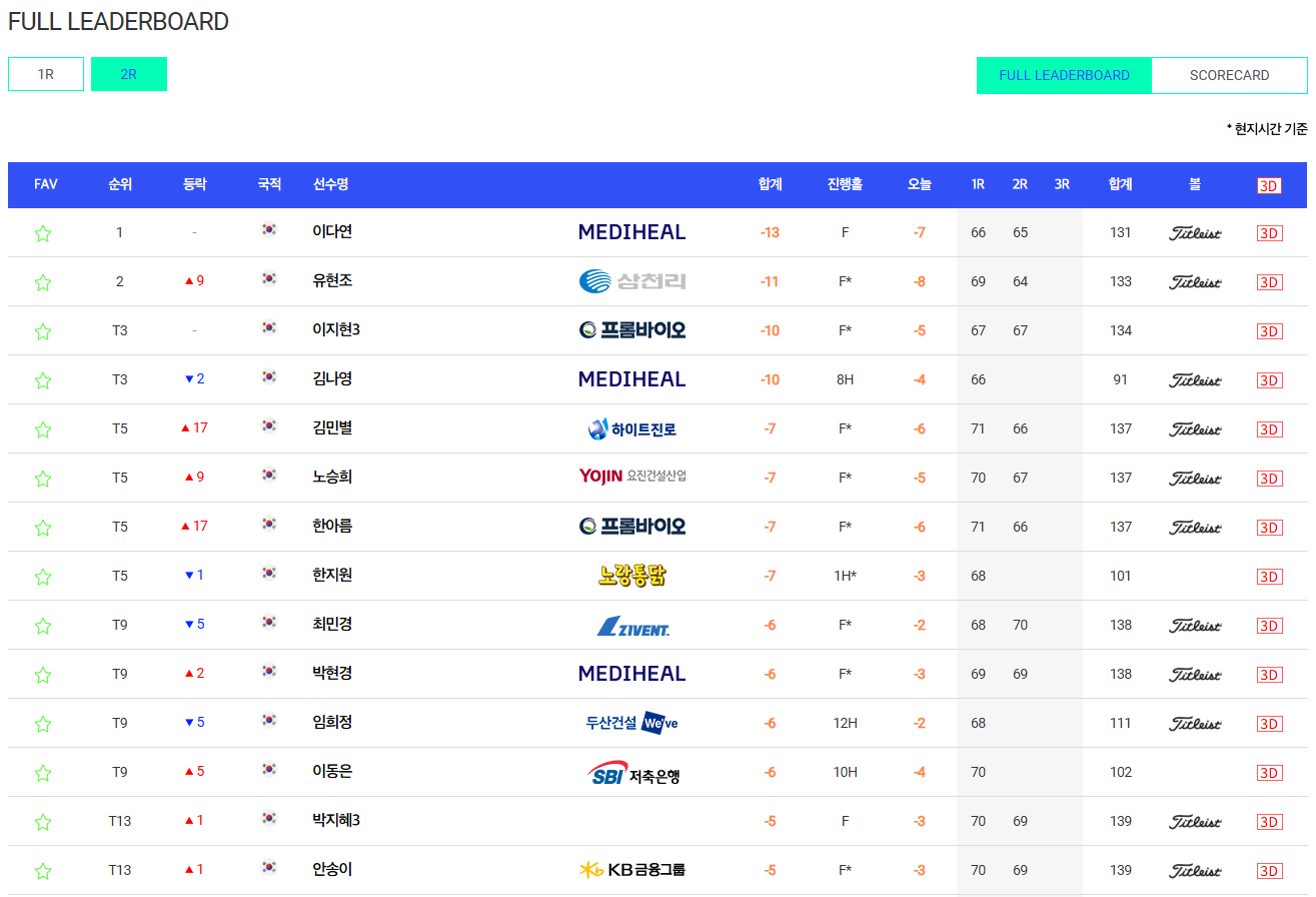 - 김나영(10언더파, 2라운드 8홀 진행중): 1라운드 공동 선두였던 김나영 역시 2라운드 중간에 4타를 더 줄이며 '끝까지 모른다'는 골프의 묘미를 완성하고 있습니다.