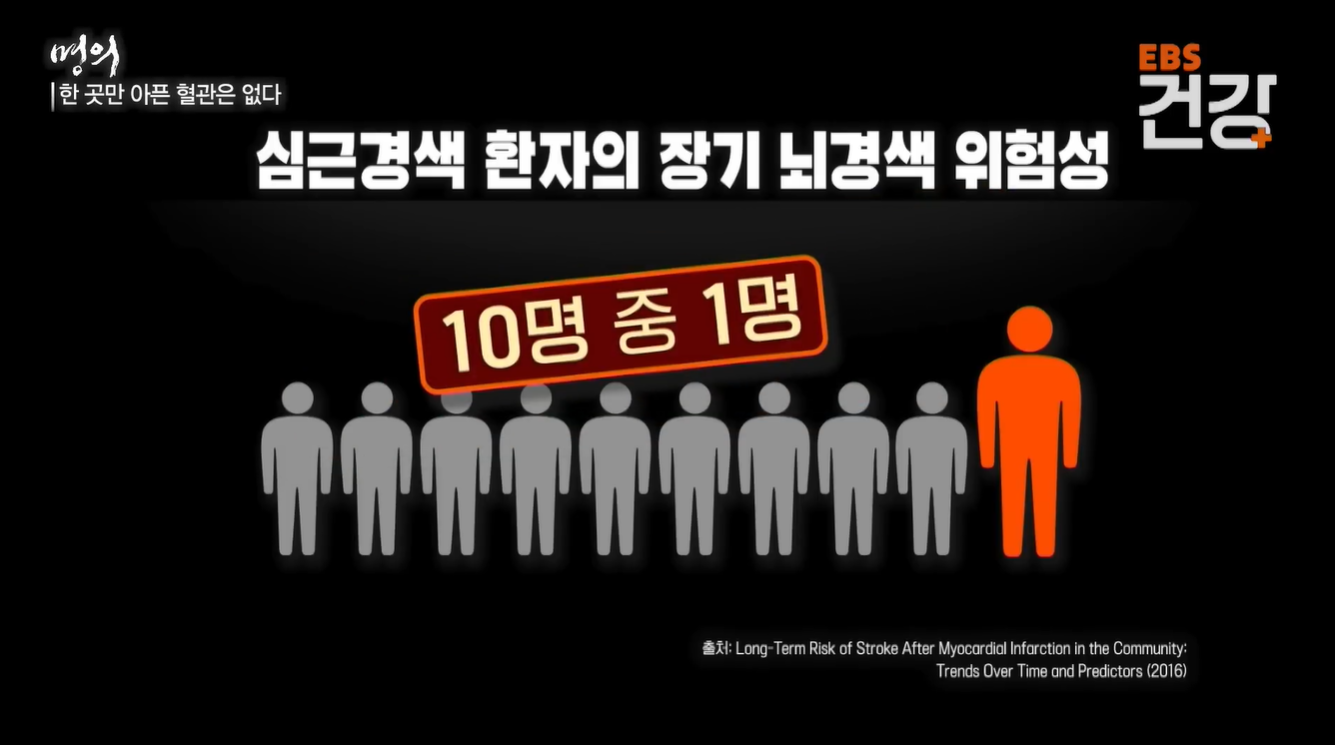- 심근경색 환자 10명 중 1명은 뇌경색이 동반.