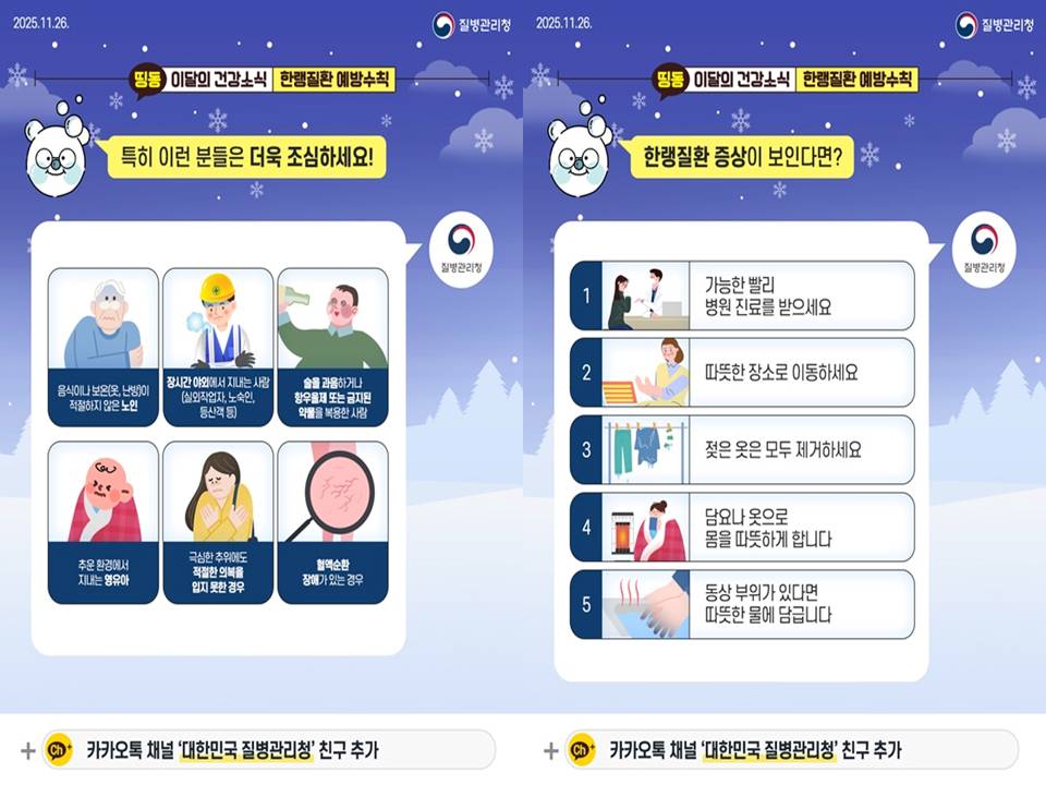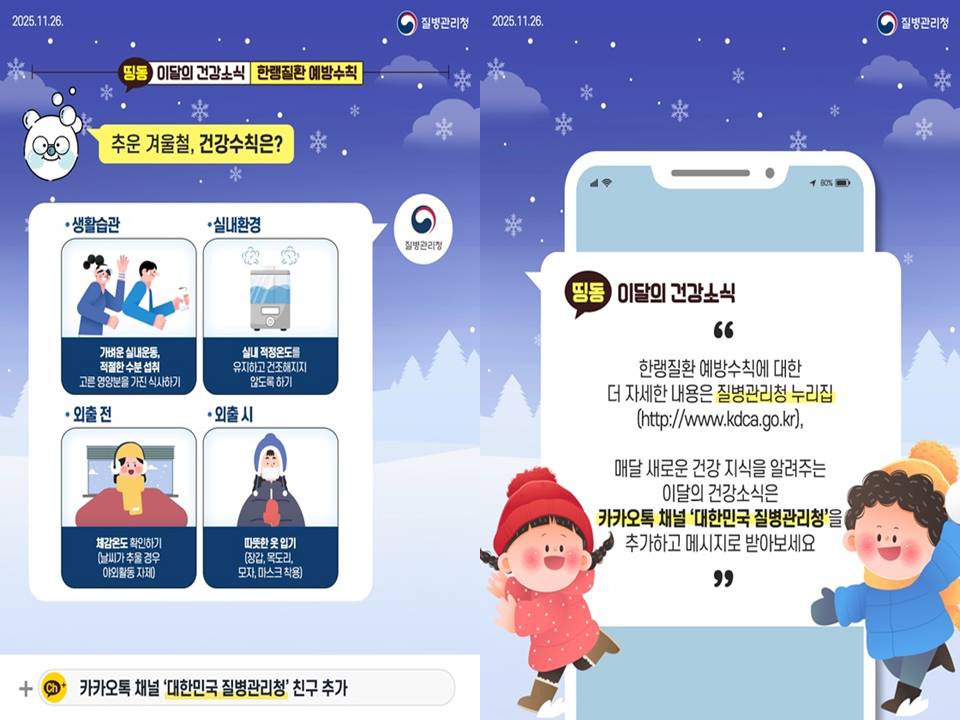 한랭질환 예방수칙에 대한 더 자세한 내용은 질병관리청 누리집(홈페이지)에서 확인하실 수 있습니다. 또한, 매달 새로운 건강 지식을 알려주는 '이달의 건강소식'은 카카오톡 채널 '대한민국 질병관리청'을 추가하고 메시지로 받아보실 수 있으니, 지금 바로 추가하고 유용한 건강 정보를 놓치지 마세요!