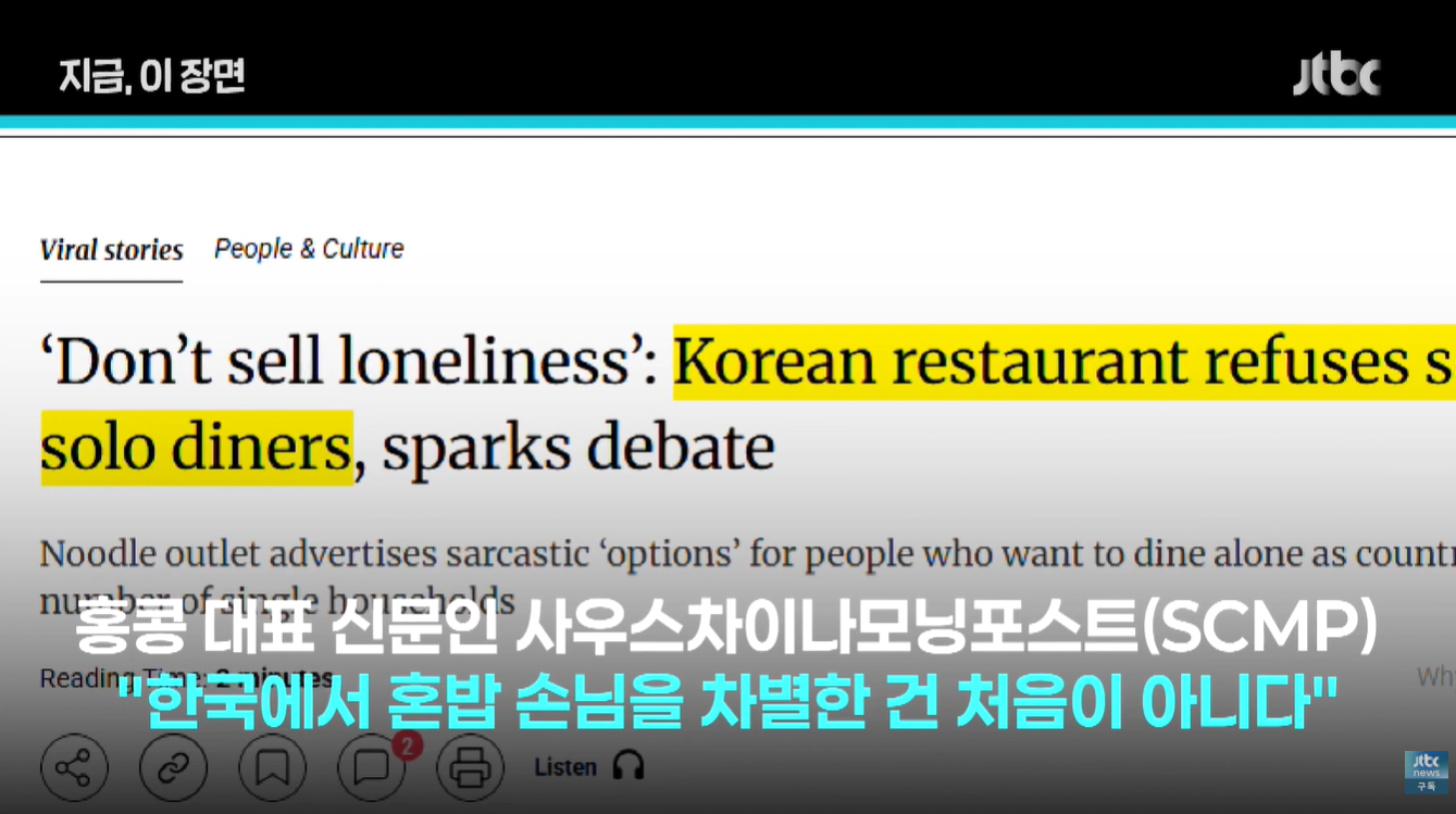 이 사건은 국내를 넘어 국제적인 논란으로 비화되었습니다. 특히 유력 외신인 사우스차이나모닝포스트(SCMP)는 이 사건을 보도하며 한국 내 '혼밥 차별' 관행이 전혀 새로운 현상이 아님을 지적했습니다.