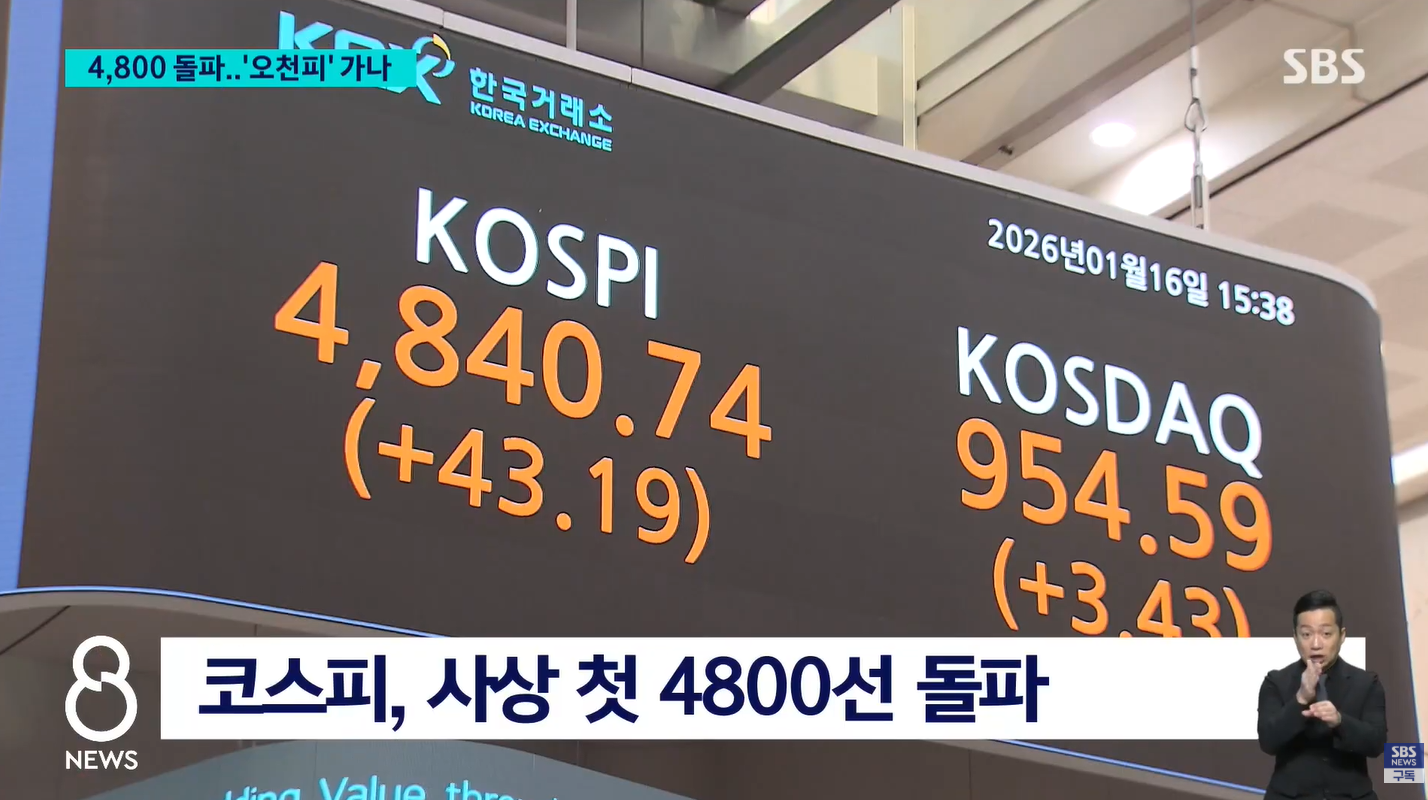 - 최고치 경신: 코스피 지수는 오늘 43포인트 상승한 4,840.45로 마감하며 사상 최고치를 다시 한번 갈아치웠습니다. 장중에는 무려 4,853선까지 치솟기도 했죠.