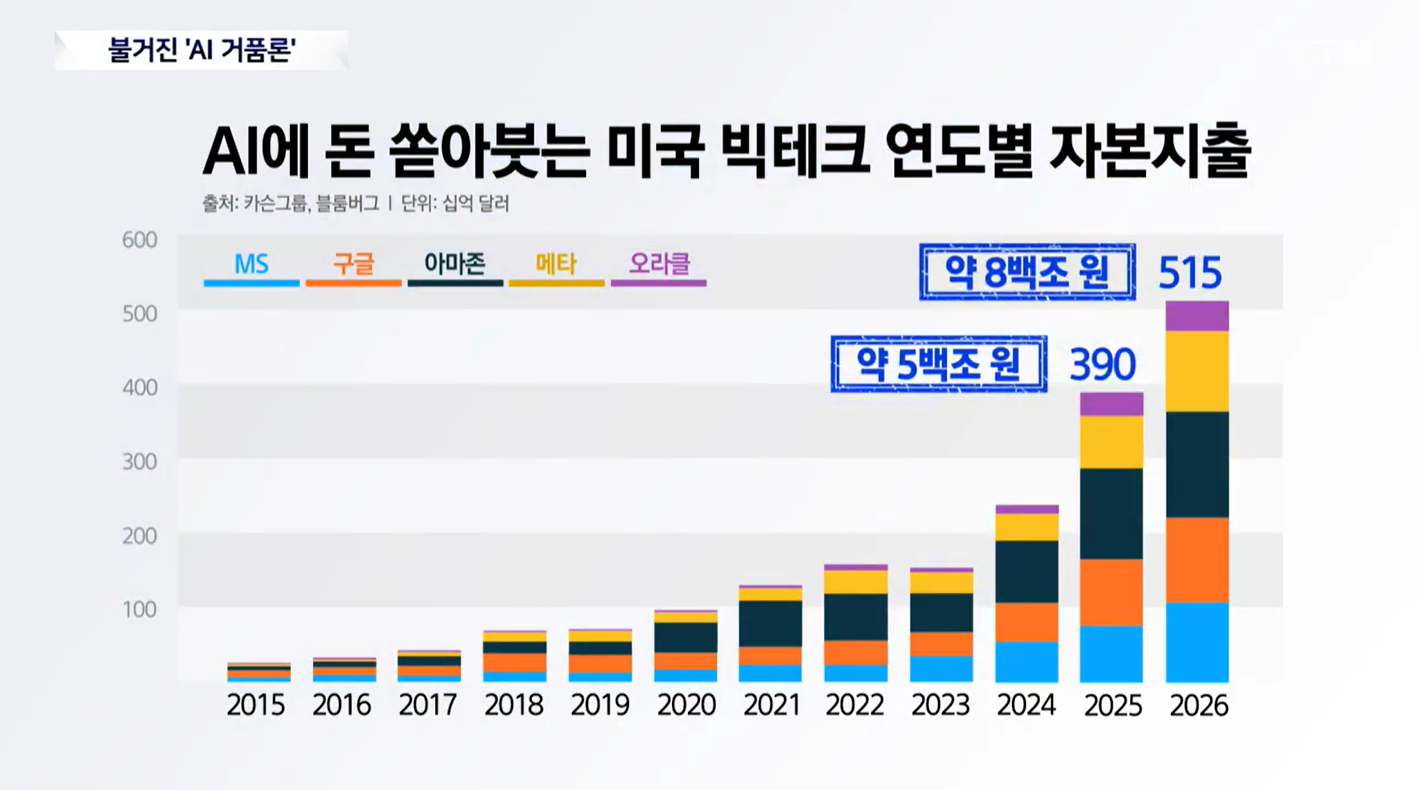 - 천문학적 투자금: 지난해 미국 빅테크 5개 기업이 쏟아부은 돈은 약 500조 원이며, 올해는 800조 원(5,150억 달러)에 육박할 전망입니다.