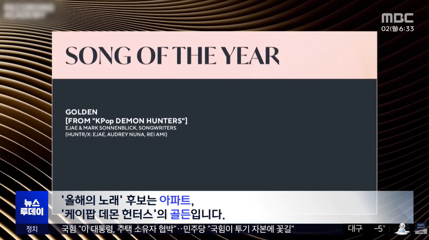 - 5개 부문 노미네이트: 케데헌의 주제곡 '골든(Golden)'은 이번 그래미에서 '올해의 노래'를 포함해 무려 5개 부문 수상 후보로 이름을 올렸습니다.