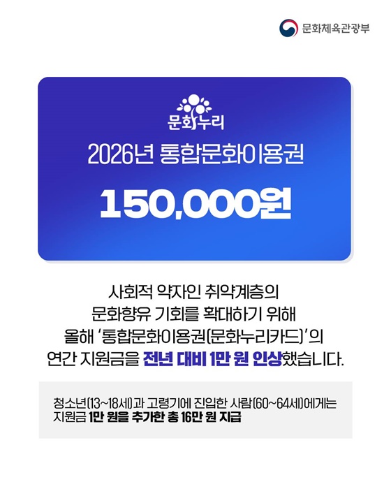 드디어 기다리던 2026년 통합문화이용권(문화누리카드) 지원 사업이 시작되었습니다! 특히 올해는 물가 상승을 고려해 지원 금액이 인상되었고, 특정 연령층에게는 보너스 혜택까지 더해졌다고 하는데요.
