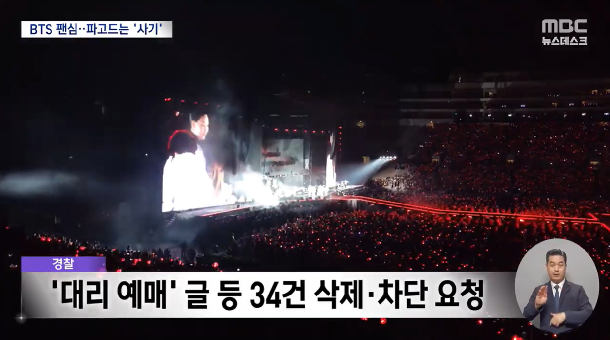 - 게시물 삭제: 경찰은 오늘 BTS 콘서트와 관련해 사기가 의심되는 대리 예매 게시물 등 34건에 대해 즉시 삭제 및 차단 요청을 내렸습니다.