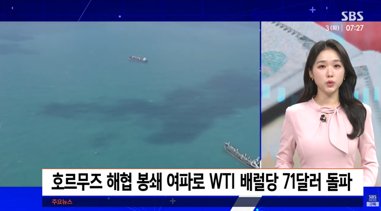 - 국제유가 급등: 전 세계 원유 수송의 요충지인 호르무즈 해협 봉쇄 발표로 WTI(서부 텍사스산 원유) 가격이 6% 넘게 폭등하며 배럴당 71달러 선을 돌파했습니다.